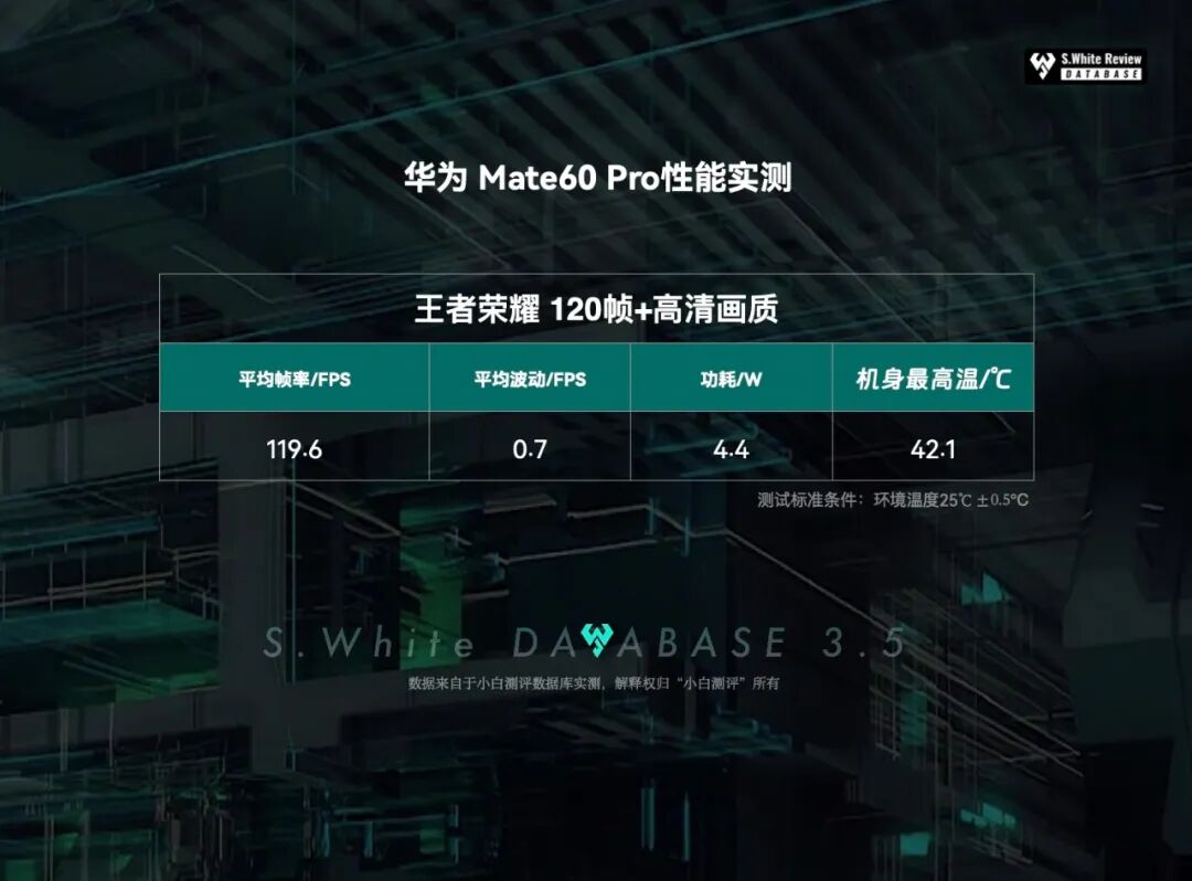具体华为Mate60 Pro更新后,数据库实测30分钟《王者荣耀》120帧+高清画质,平均帧率119.6 FPS,功耗 4.4W,机身最高温度 42.1℃。