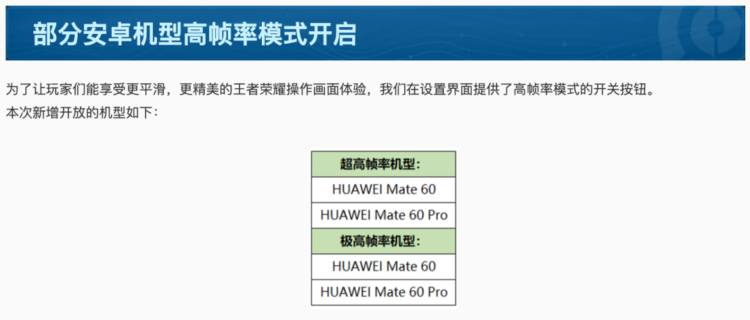 今天《王者荣耀》全服不停机更新公告提到现在超高帧率和极高帧率已新增开放华为Mate 60 Pro和Mate 60两款机型。