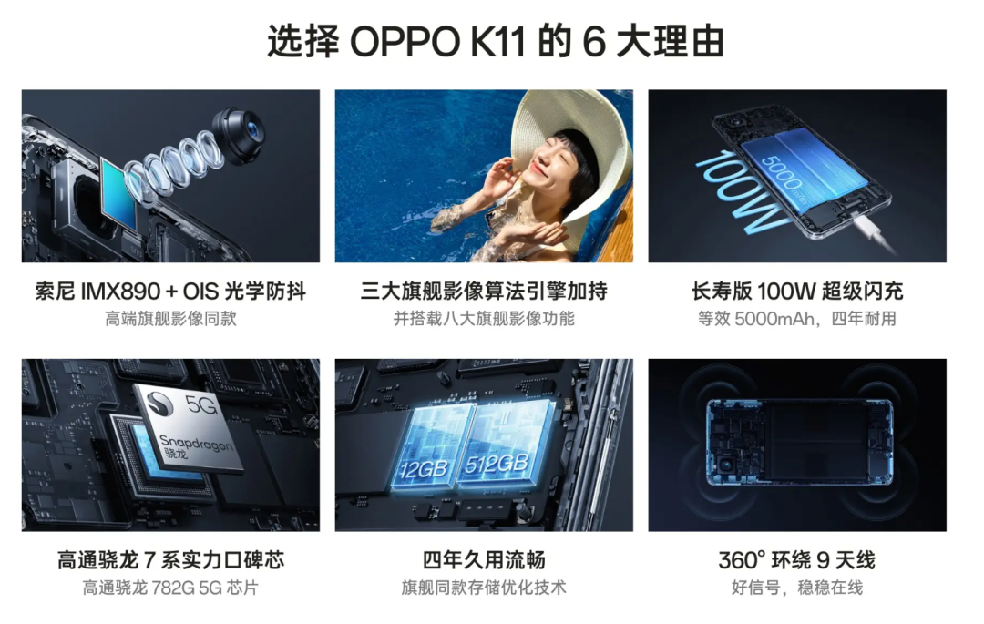 核心配置上,OPPO K11搭载高通骁龙782G处理器,高性能石墨散热系统,4129mm²VC散热面积,通过TÜV南德48个月A级流畅认证,前置16MP,后置50MP(索尼IMX890有OIS 旗舰影像算法下放)+8MP+2MP,5000mAh电池,100W有线充电,支持多功能NFC、红外遥控,立体双扬声器、X轴线性马达都有配备。