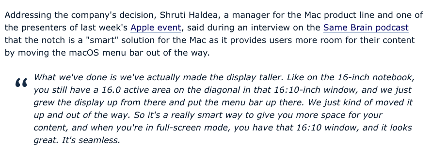 macrumors 报道称苹果 Mac 产品线经理 Shruti Haldea 在接受Same Brain 播客采访时表示;「刘海缺口是 Mac 的“智能”解决方案(也有翻译是“聪明的方式”),能通过将 macOS 菜单栏移开为用户提供更多内容显示空间。」