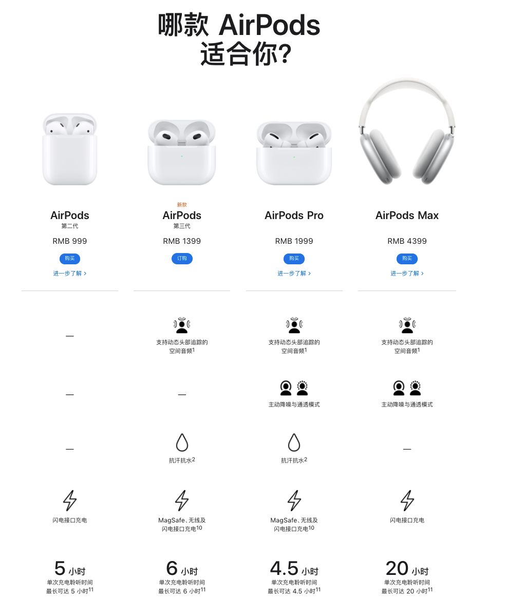 首先是AirPods 3,时隔两年,终于等到了AirPods系列产品更新,这次更新的AirPods 3简单给大家提炼几个要点:佩戴感一如既往舒适的半入耳式设计、不支持降噪、耳柄更短,续航提升,支持空间音频等。