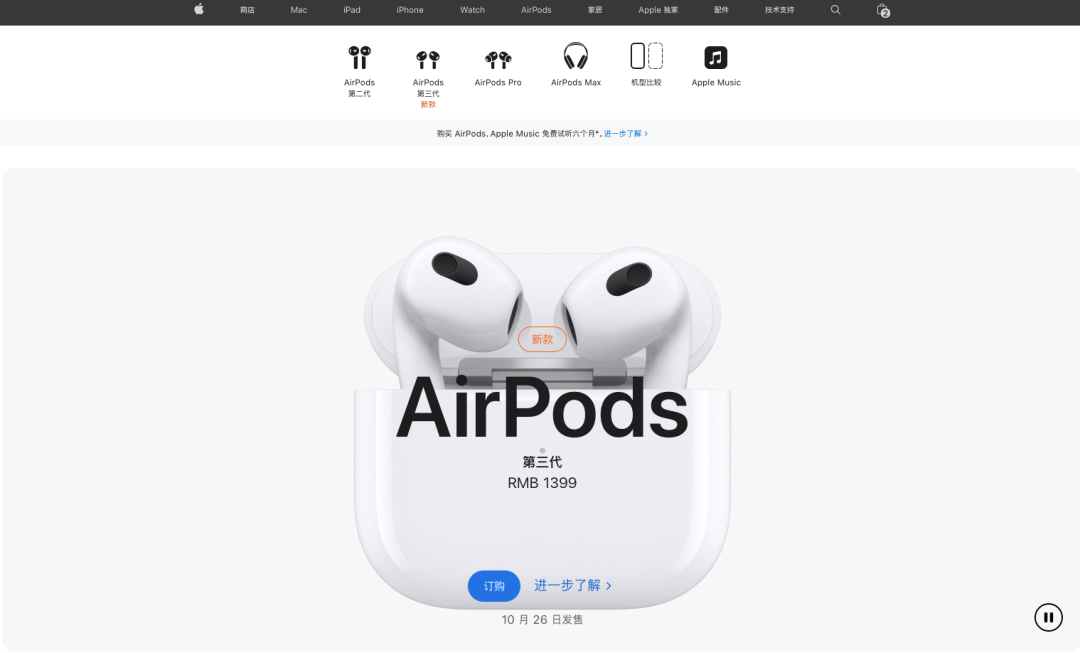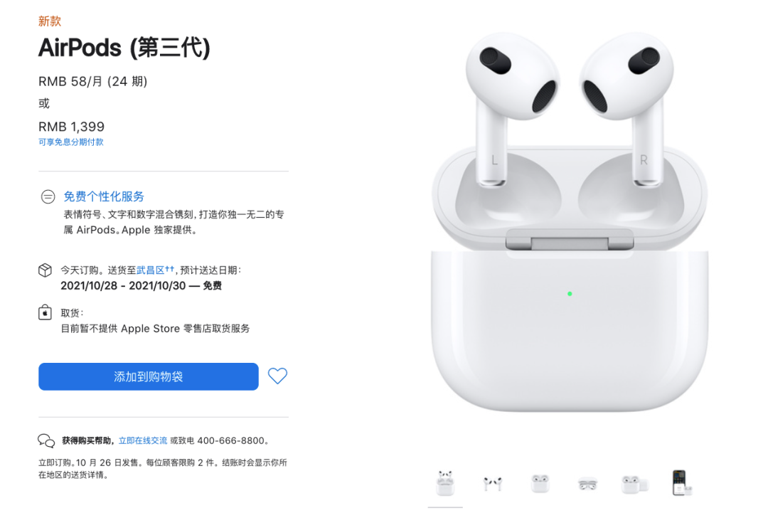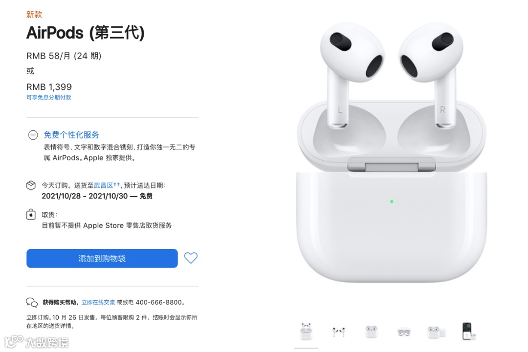 价格上,AirPods 3国行售价1399元,目前已经可以预购,将于10月26日正式发售。