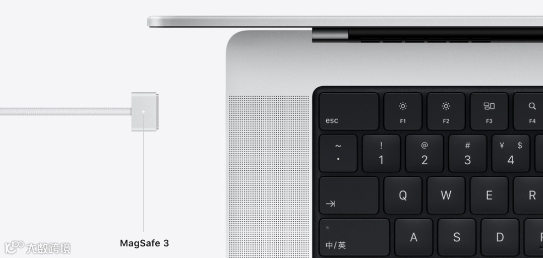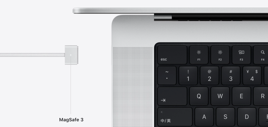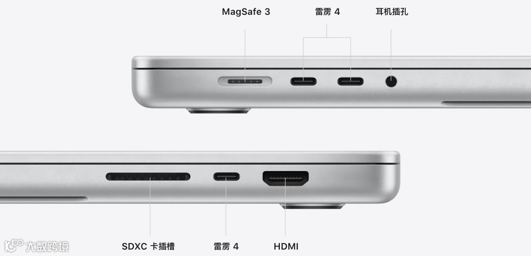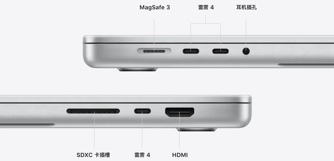 细节上,新款MacBook Pro也有更丰富的接口,MagSafe 3充电口,3*USB-C 雷电 4接口、1*HDMI 2.0、1*SD卡插槽、1*3.5mm音频耳机孔。
