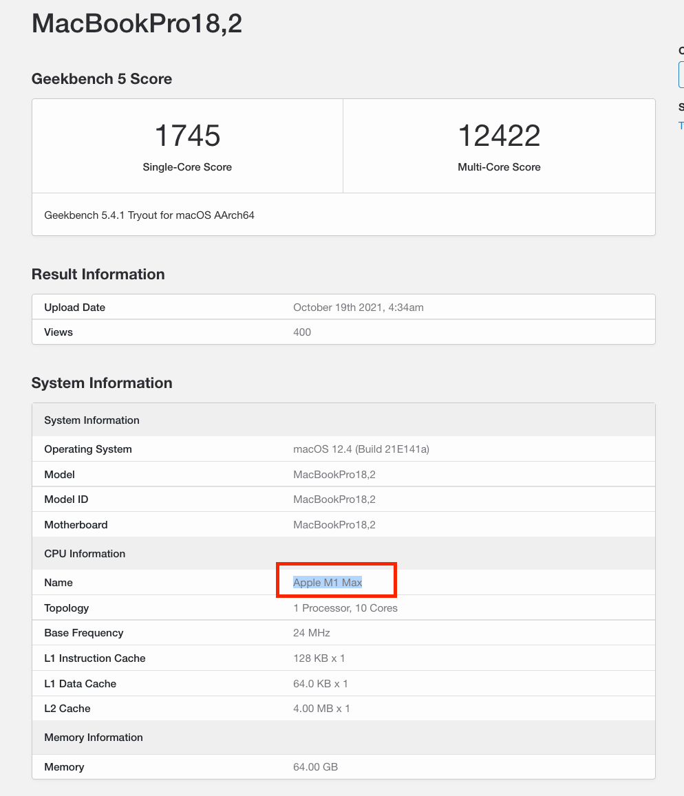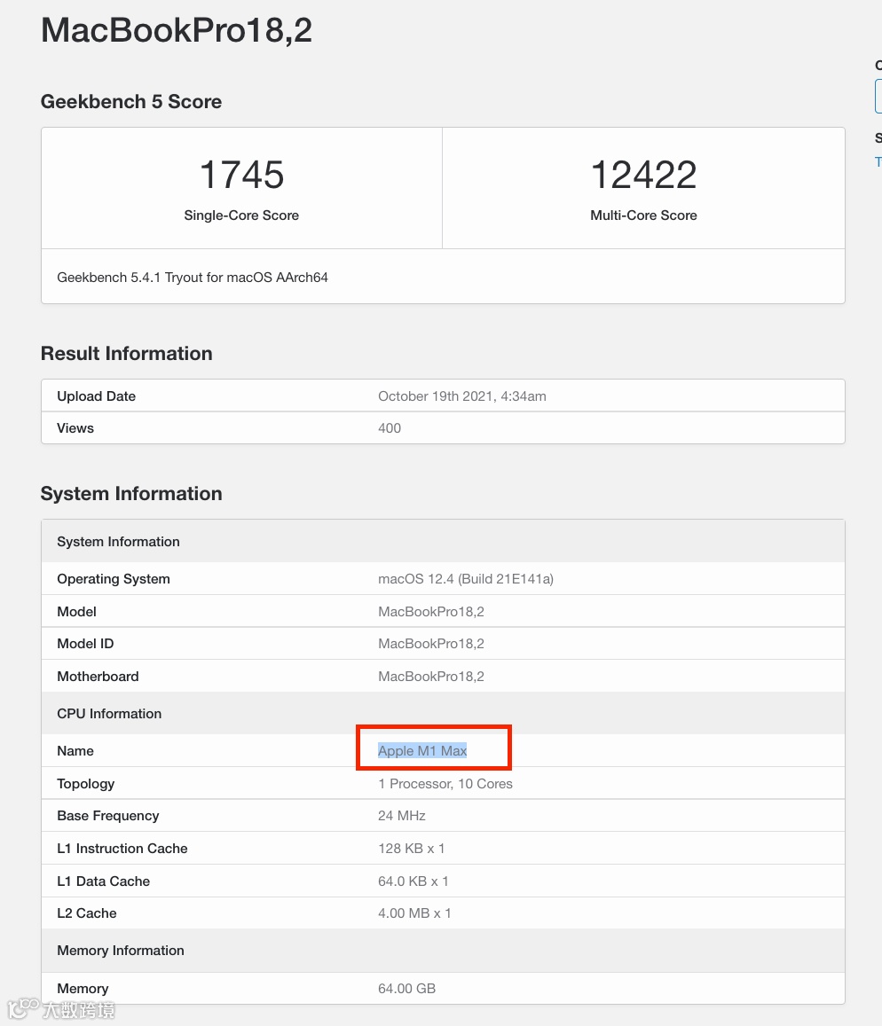 以Geekbench 5跑分为例,苹果新款MacBook Pro搭载的全新「M1 Max」处理器单多核跑分1745/12422,对比MacBook Air搭载的「M1」单多核1740/7700(后台随机一组),「M1 Max」的多核跑分猛增