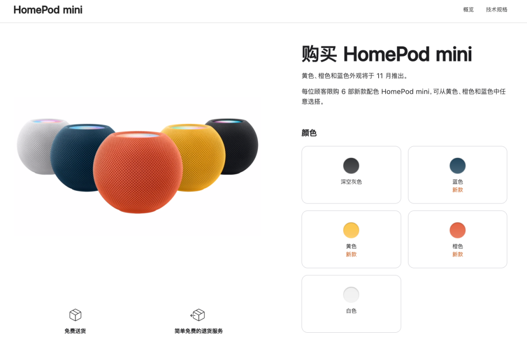 多彩HomePod mini:新增蓝色、橙色、黄色,国行售价749元,这仨新色将于11月推出。