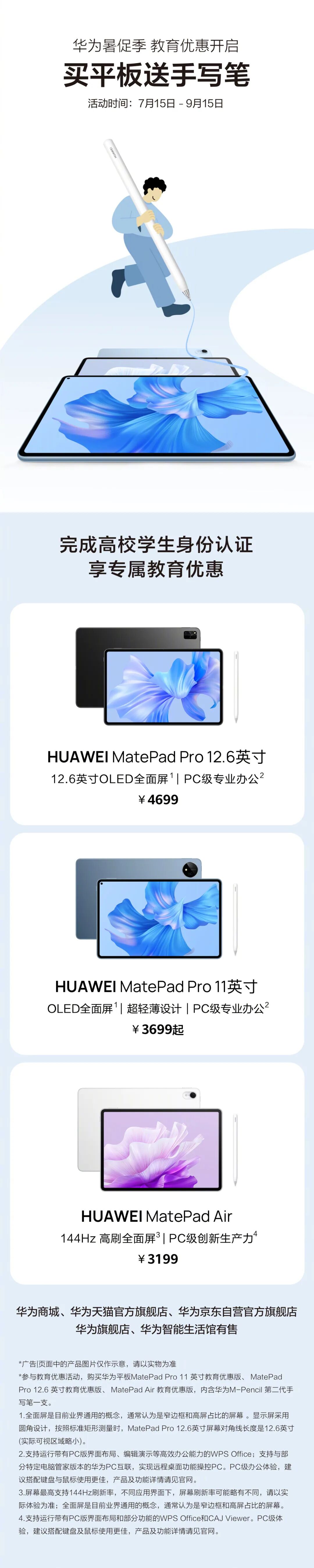 据官方官方表示,7月15日即今天起至9月15日,购买华为平板 MatePad Pro 11 英寸教育优惠版、MatePad Pro 12.6 英寸教育优惠版、MatePad Air 教育优惠版赠送价值 599 元的 HUAWEI M-Pencil 第二代手写笔。