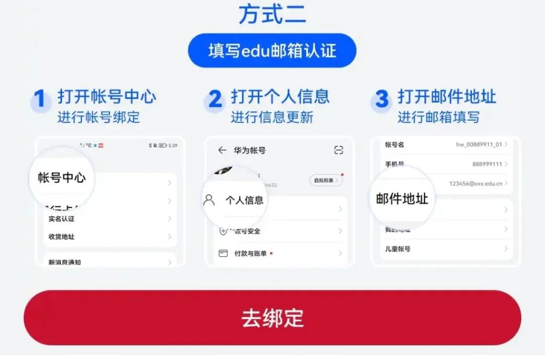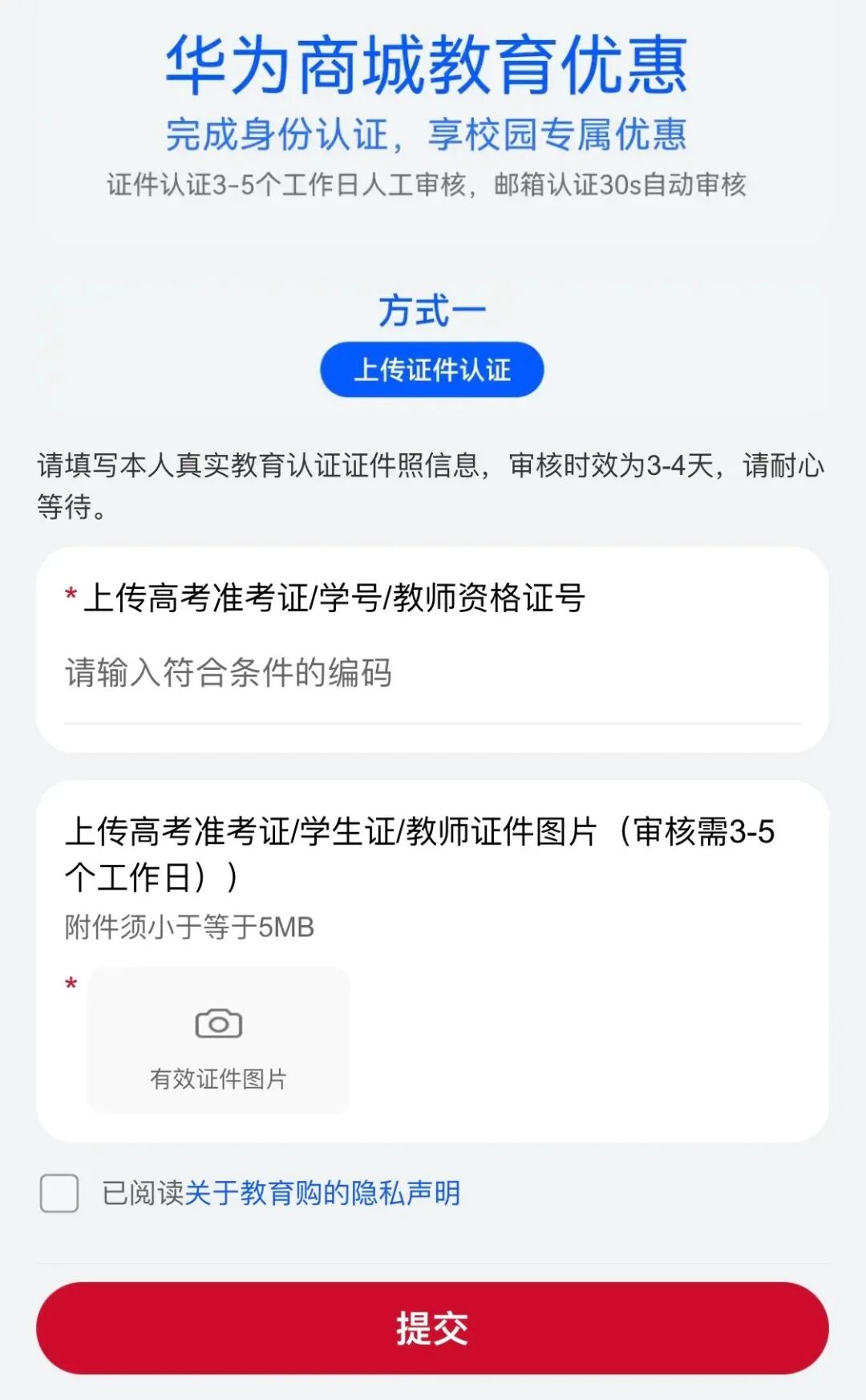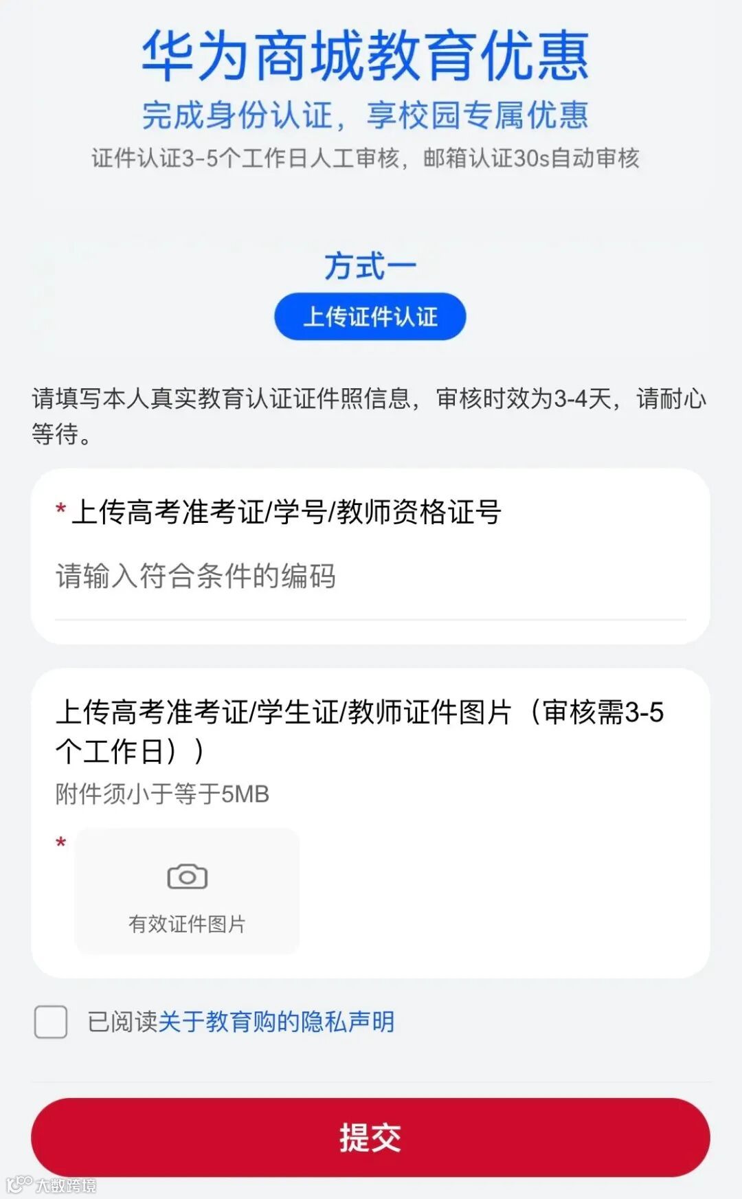 具体参与方式也很简单,以华为商城为例,完成高校学生身份认证即可参与。认证方式一:上传高考准考证/学号/教师资格证号等本人真实教育认证证件照信息,提升等待审核即可;方式二:在账号中心绑定你的edu邮箱地址即可。有需要的小伙伴可以去看看。