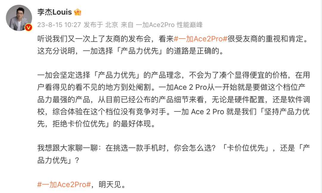 昨晚Redmi K60至尊版在公布12+256GB 2599元起售后,不少网友调侃“卢伟冰广场”“卢来佛祖牛B”,估计不少人看到价格都会感到惊讶,这也让压力来到和K60至尊版打擂台的一加Ace2 Pro,今天高管发布了一组新的海报。