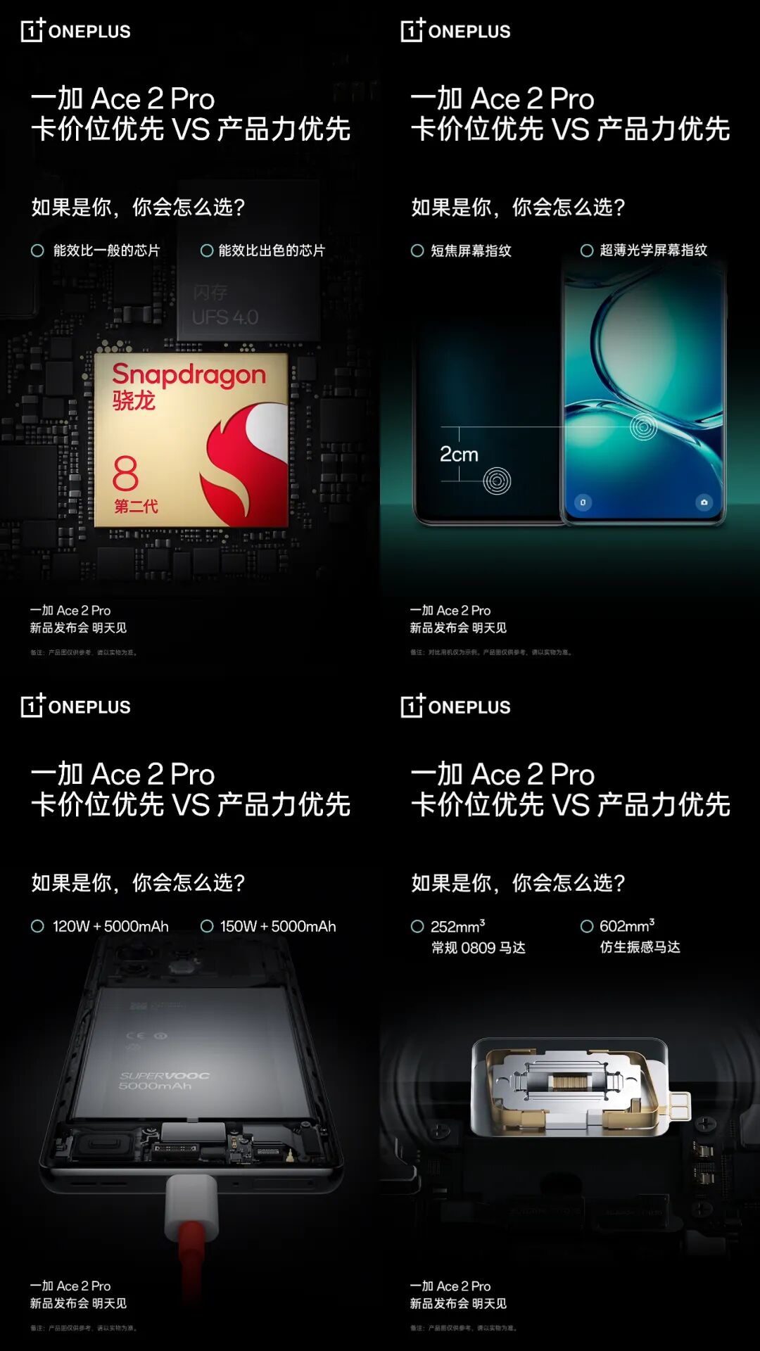 一加中国区总裁李杰发布了四张海报,算是提前列出相比Redmi K60至尊版的四大卖点:骁龙8 Gen2处理器、超薄光学屏下指纹、5000mAh电池+150W有线充电、602mm³超大体积仿生振感马达。