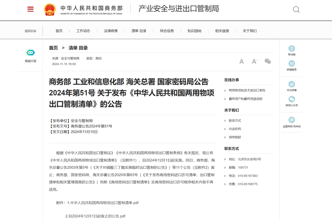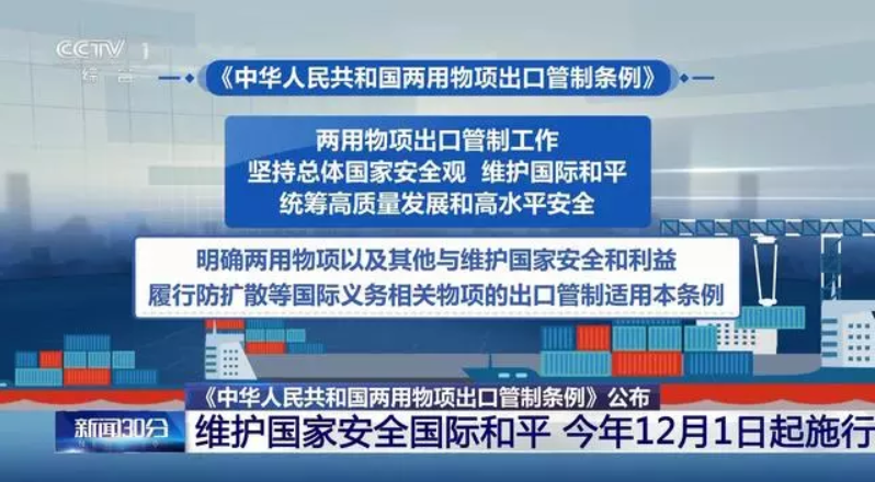 2024年9月18日国务院第41次常务会议通过《中华人民共和国两用物项出口管制条例》。