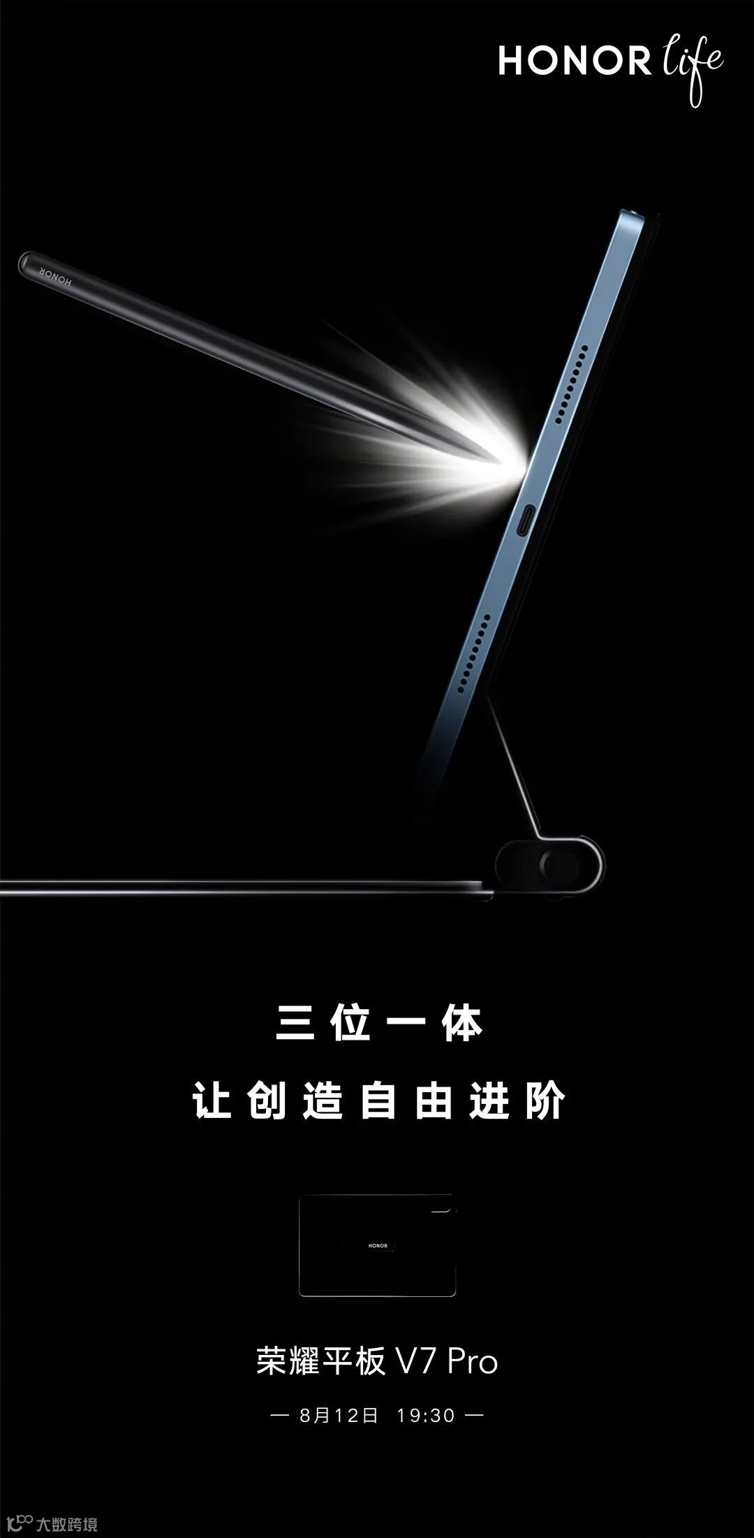 如上图所见,荣耀平板V7 Pro预热海报显示其也有和iPad Pro相似的妙控键盘和支架,并支持手写笔。稍微有些尴尬的是,平板机身底部的充电口并没有居中...