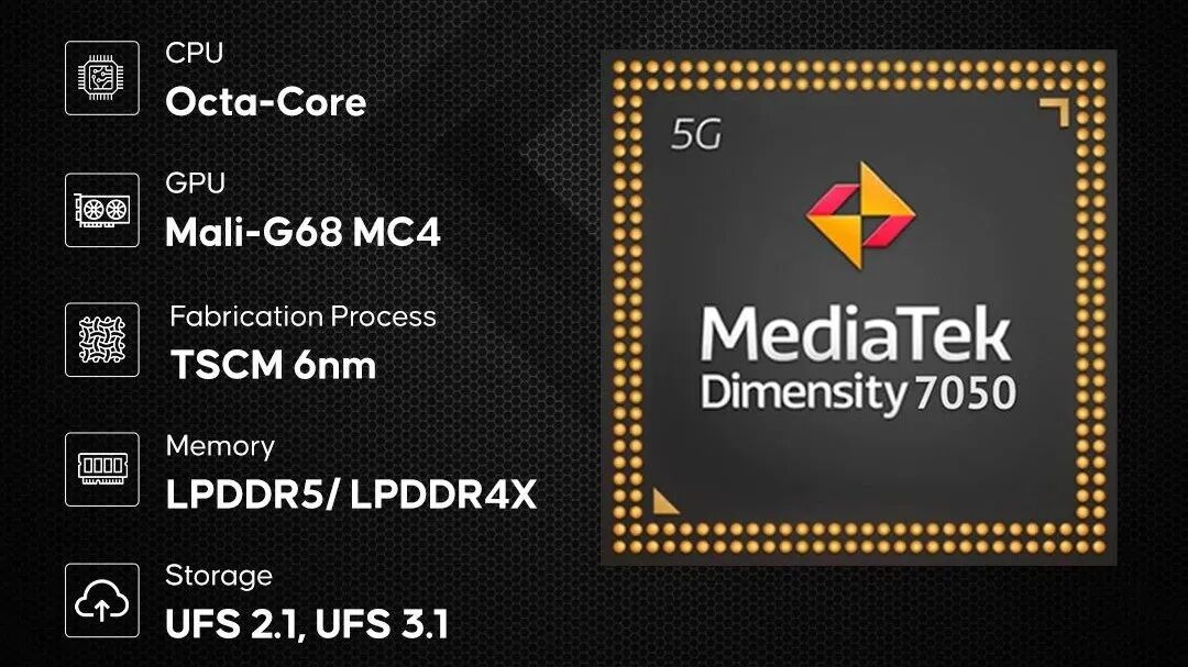 作为补充:联发科官网显示,天玑7050采用台积电6nm工艺制程,CPU为2*Cortex-A78 2.6Ghz + 6*Cortex-A55 2.0Ghz ,Mali-G68 MC4 GPU,APU 3.0,最高支持200MP。基础规格和之前真我10 Pro+采用的天玑1080一样,疑似天玑1080改名版。