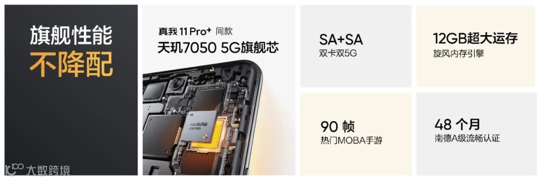 核心配置上,真我11 Pro+搭载联发科天玑7050处理器,支持5G,5000mAh电池、100W有线充电(号称价位段首个全链路GaN百瓦闪充),最高1TB版存储可选,NFC、杜比双扬、X轴马达、全速矩阵天线系统2.0、realme UI 4.0等。