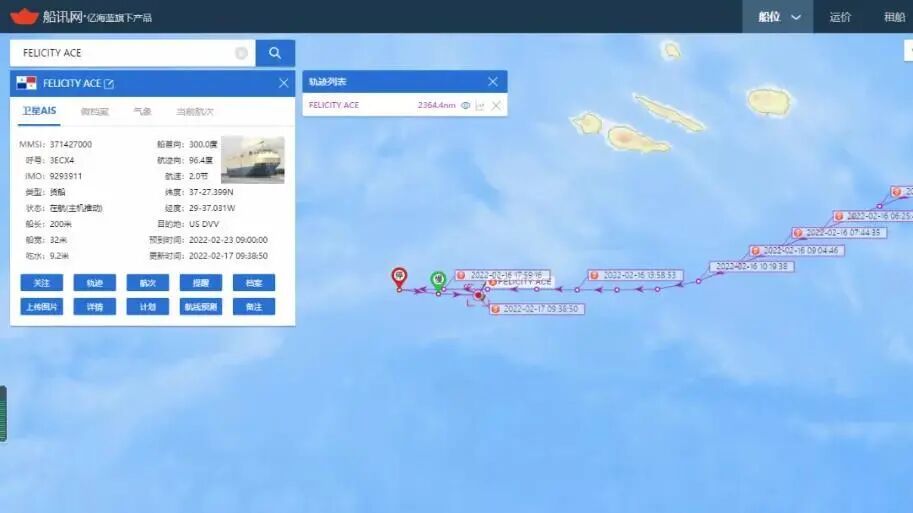 一艘满载保时捷和大众汽车名为FELICITY ACE的滚装船在大西洋亚述尔岛西南偏南约90海里发出遇险信号称,该轮的货舱突发火灾。