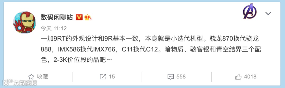 基础参数不变,依然是120Hz AMOLED柔性直屏,4500mAh电池+65W有线快充等。前几天《原神》还提前透露了会和一加合作的消息,预热一加&《原神》合作款产品将于11月正式开售,所以估计一加9RT发布时间应该就是10月中下旬,不知道有多少观望的~