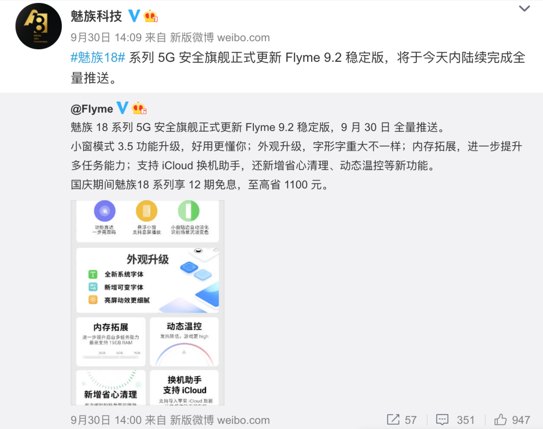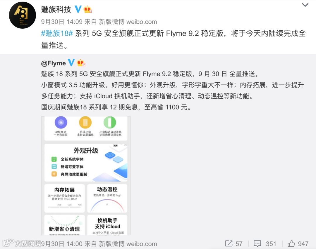 日前发布的魅族18S、魅族18S Pro还一同带来了全新的Flyme 9.2系统,现据最新消息,上半年发布的魅族18、魅族18 Pro目前已经全量推送Flyme 9.2。