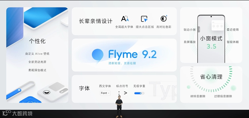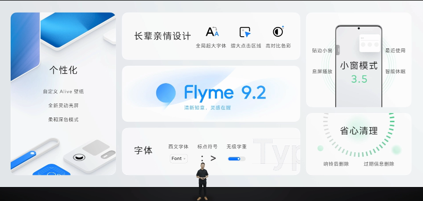 作为补充,据了解全新Flyme 9.2主要有这么几个升级:①外观升级全新系统字体、灵动亮屏效果、自定义Alive壁纸新增部分息屏效果、新增三种桌面效果、支持个性化任意混搭;②「全新小窗模式3.5」:优化体验,自动淡化降低干扰、智能识别沉浸变色,支持息屏播放、最近使用、功能直达等;
