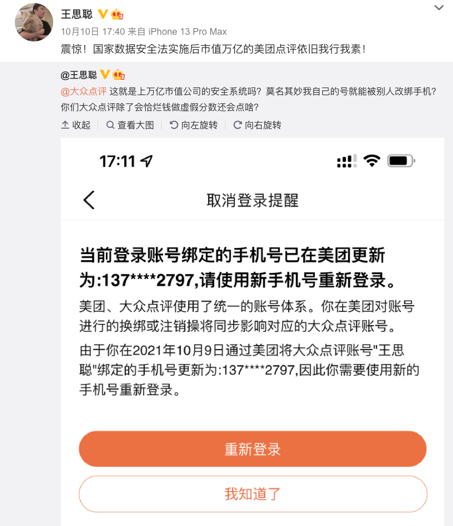 另一边,美团方面似乎目前并没有针对其App后台多次访问用户地理位置进行回应,昨晚王思聪也在微博炮轰其账号被陌生人改绑手机号,质疑美团的安全系统。美团目前同样暂未回应。