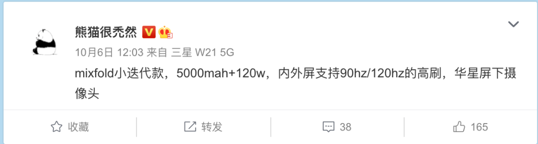 数码博主爆料称,小米MIX FOLD小迭代款配置或有:5000mAh电池+120W快充,内外屏支持90Hz/120Hz高刷,同时采用华星光电的屏幕方案,或配备屏下摄像头。