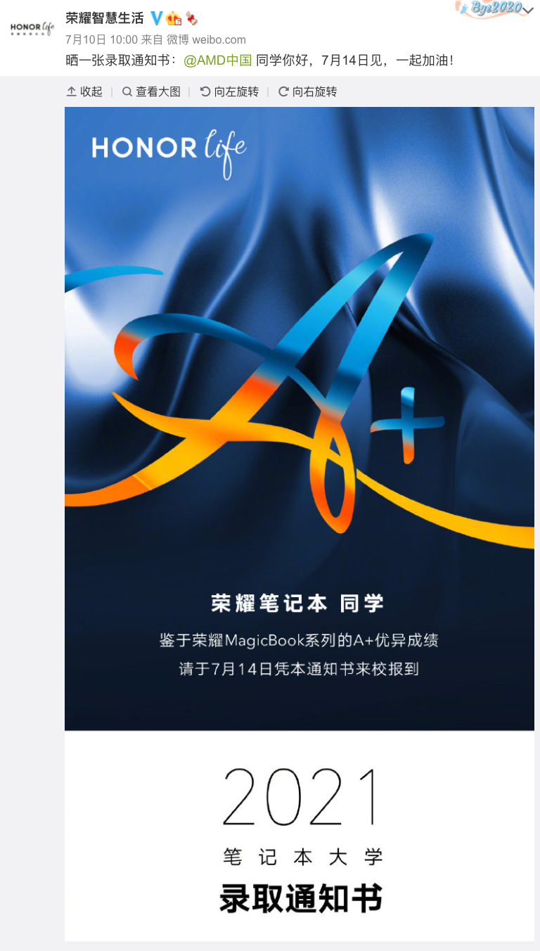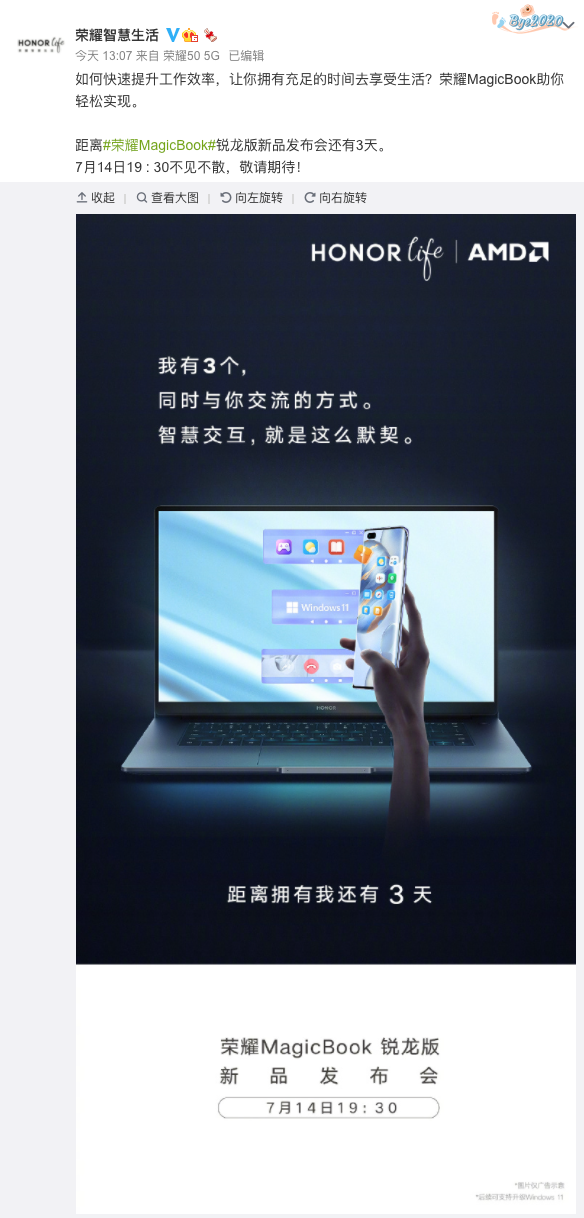 荣耀MagicBook系列的新款笔记本电脑,搭载AMD锐龙处理器,将于7月14日也就是下周三19:30发布