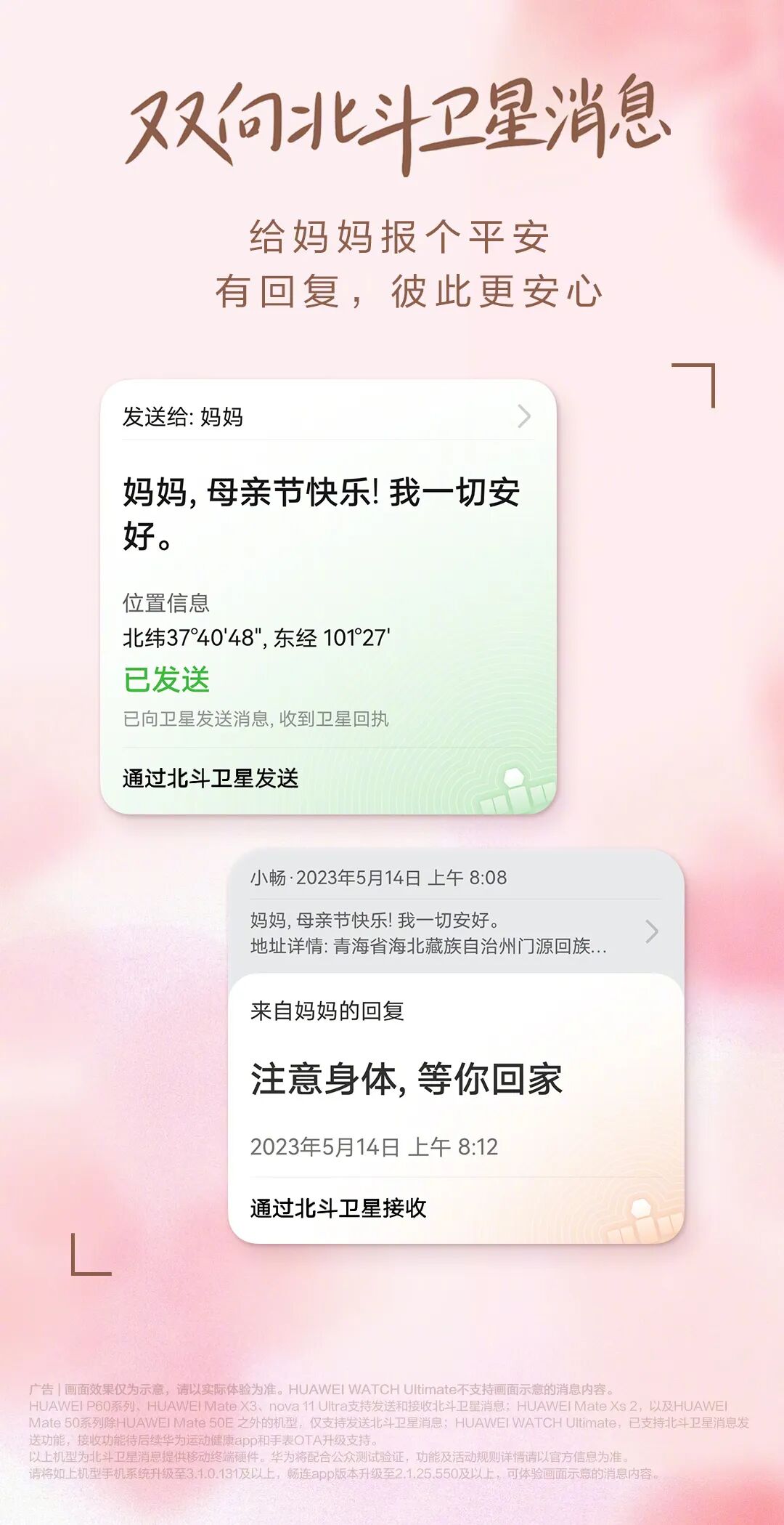 据了解华为多款设备均支持北斗卫星消息:华为P60系列、华为 Mate X3、华为 nova 11 Utra支持发送和接收北斗卫星消息;华为 Mate Xs 2、华为 Mate 50 系列(Mate 50E除外) 仅支持发送北斗卫星消息;华为 WATCH UItimate,已支持北斗卫星消息发送功能,接收功能待后续华为运动健康 App 和手表 OTA 升级支持。以上机型为北斗卫星消息提供移动终端硬件。将如上机型手机系统升级至 3.1.0.131 及以上,畅连 App 版本升级至 2.1.25.550 及以上。