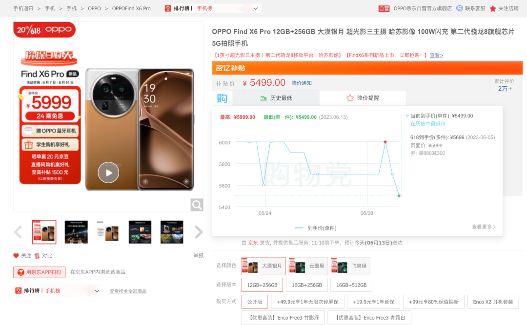 今天上午10点左右,OPPO京东自营官方旗舰店显示,Find X6百亿补贴降价300元;Find X6 Pro百亿补贴降价500元,12+256GB版从5999降为5499元,刷新历史新低价,支持24期免息,如果再叠加店铺充值金活动,应该能再便宜一两百。虽然此刻活动已结束,第三方早就是类似价格或者更低,但这次也算是官方旗舰店线上价新低,所以个人猜测过两天6.16-6.18或许会再次有活动,感兴趣的可以蹲蹲或者看看第三方。