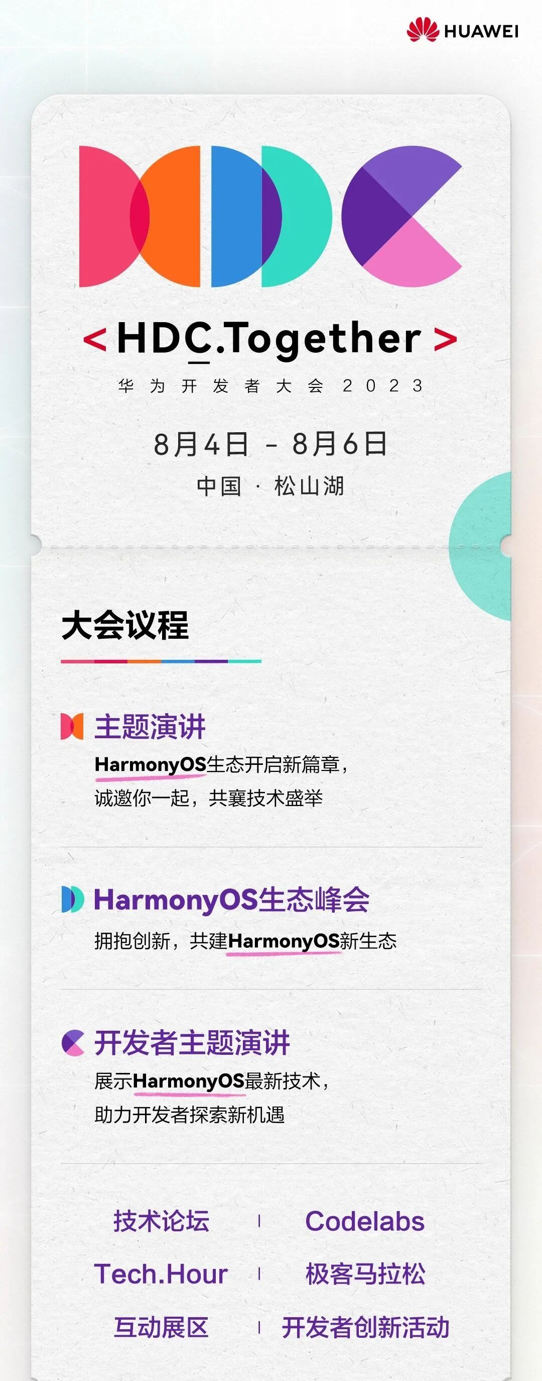 华为宣布将于8月4日-8月6日在松山湖举行HDC华为开发者大会2023,届时大会主要有主题演讲、HarmonyOS生态峰会、开发者主题演讲等几项议程,目前官方率先公布了早鸟票的价格及开售时间。细节上,海报中的“HarmonyOS生态开启新篇章”应该就是暗示全新鸿蒙系统4.0。