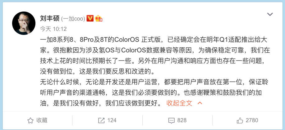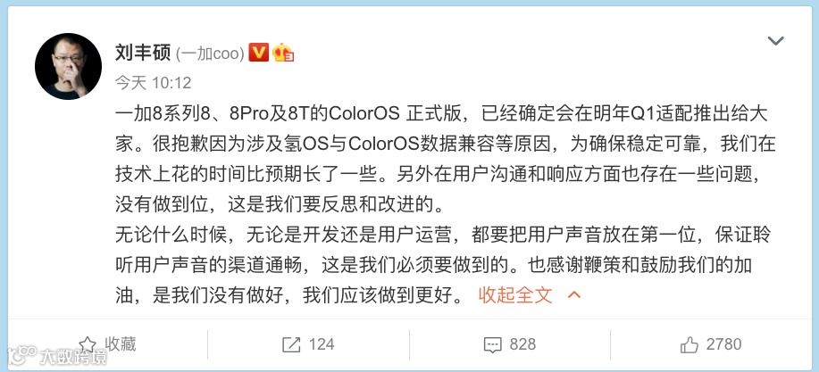 另外是一加这边,据一加手机COO刘丰硕发文表示由于涉及氢OS与ColorOS数据兼容等原因,为确保稳定可靠,在技术上花的时间比预期长了一些,所以一加8系列8、8Pro及8T的ColorOS正式版来得晚一些,现已经确定会在明年Q1第一季度(1-3月)适配推出给大家。