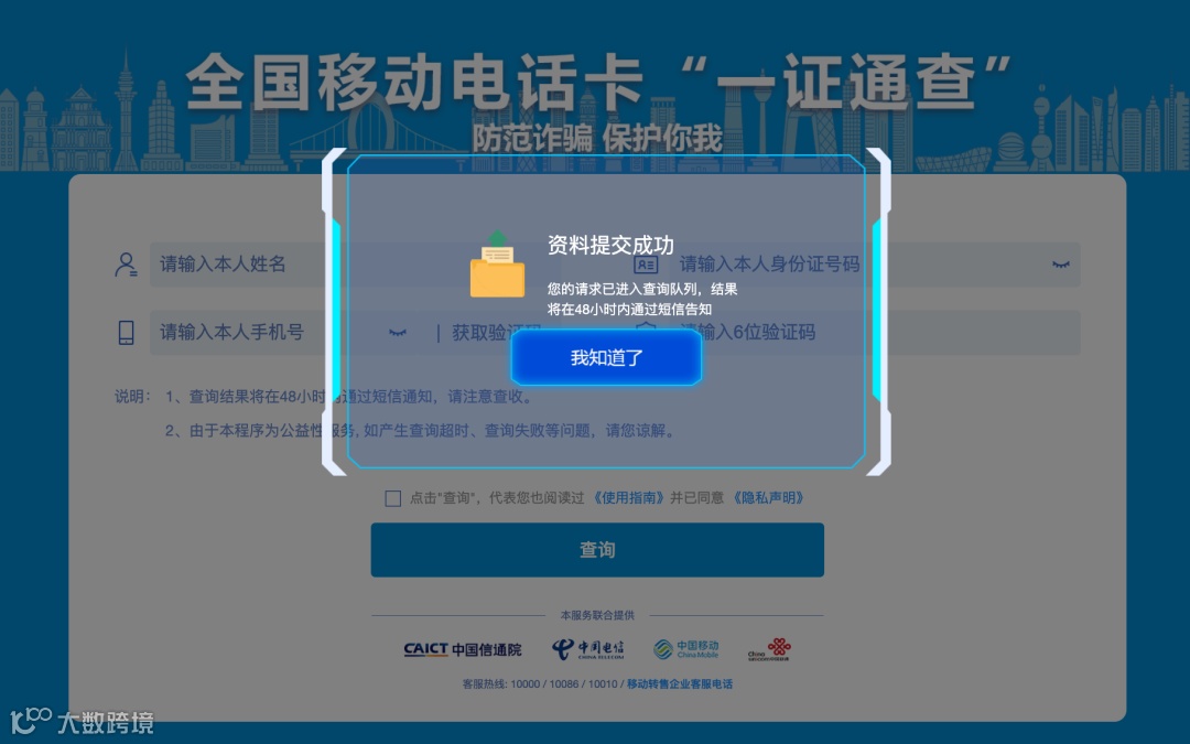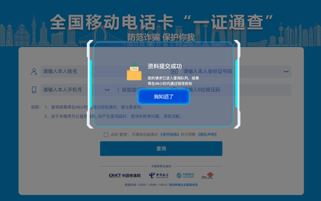亲测了一把,输入姓名、身份证、手机号并输入验证码核对是本人查询后,显示会在48小时内通过短信回复该身份证下拥有的移动手机号数量,但实际速度其实挺快,不到几分钟就收到查询结果了。