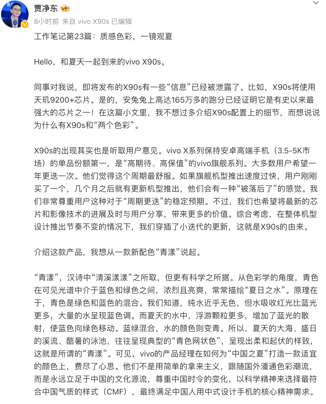 vivo品牌副总裁贾净东今天在微博表示:vivo X90s除了将搭载天玑9200+处理器外,将新增「青漾」配色,同时将首发配备「vivo质感色彩」模式,拍照风格更加浓郁(“质感色彩”就是vivo之前灰度测试的Demo X模式)。