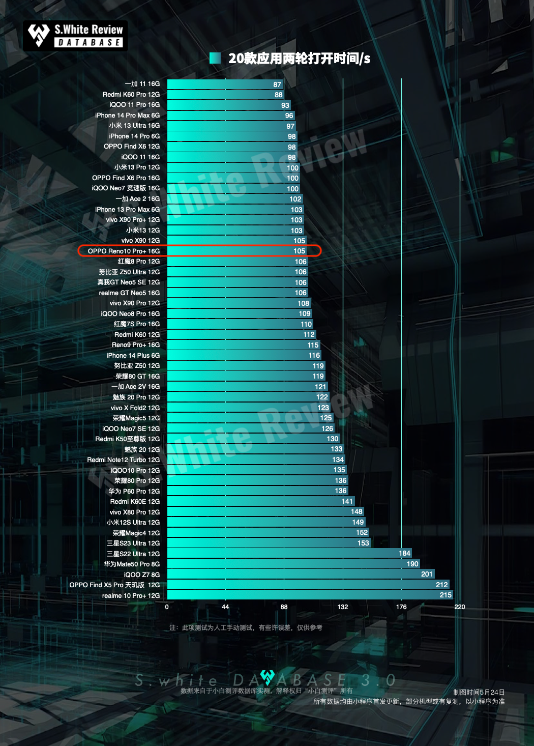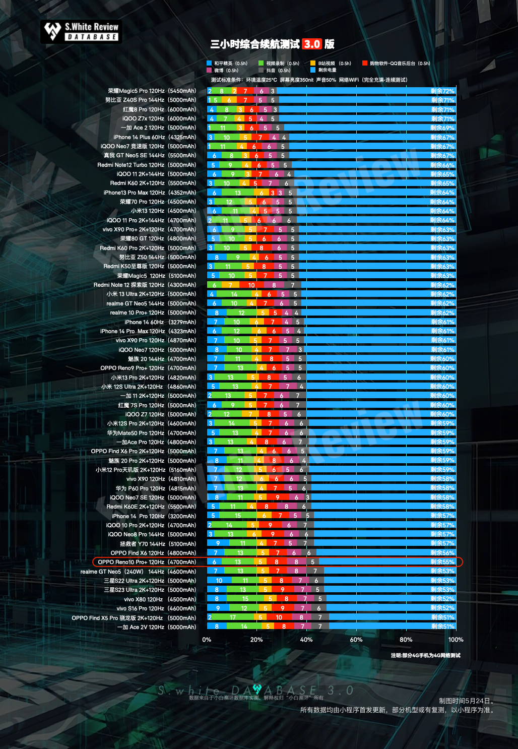 以上均基于小白测评数据库模型测试,测试标准条件:环境温25℃±0.5℃,屏幕亮度350nit,声音50%,性能模式(数据基于 OPPO Reno10 Pro+ 测试时最新版 ColorOS 13.1 PHU110-13.1.1.110(CN01) 系统测试)(*配图榜单仅为5.24小白测评数据库3.0模型下测试数据的陈列展示,不代表机圈所有手机排行)