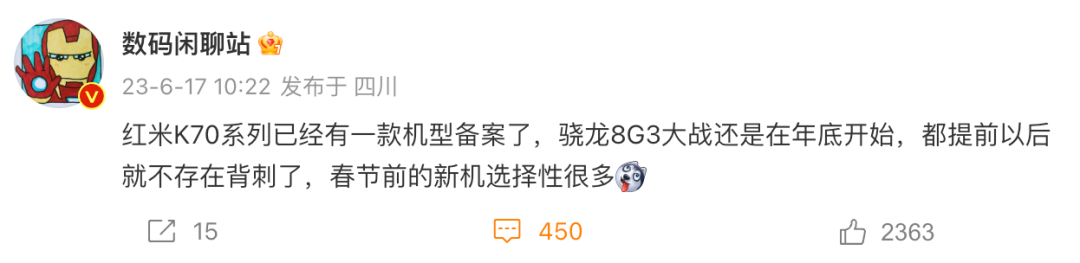 最后是Redmi这边的消息,据爆料Redmi K70系列已经有一款机型备案。现在才6月份,似乎各家新品节奏都提前了。