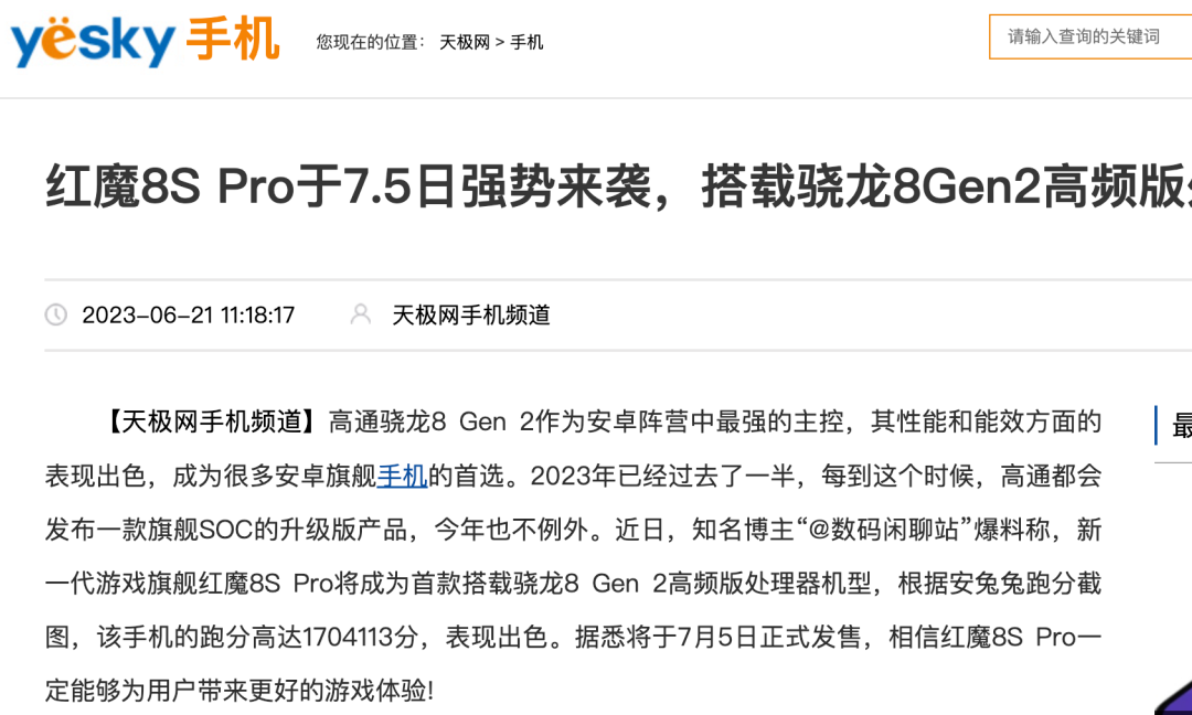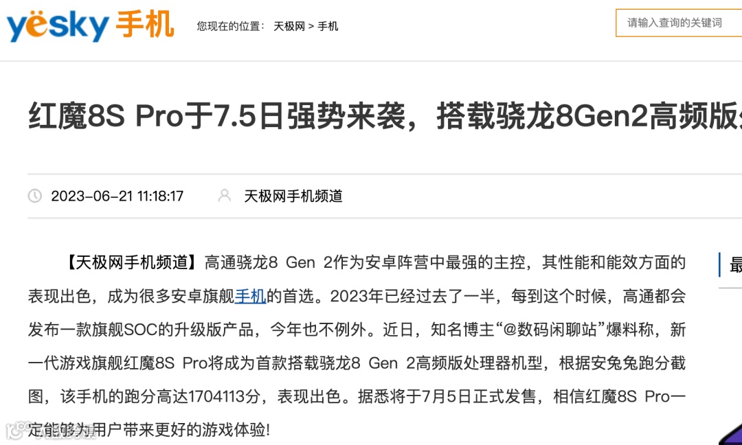 目前市面上的骁龙8 Gen2处理器有两个版本,早前消息称三星S23系列首发独占的骁龙8 Gen2超频版将结束独占期,其它厂商也会采用,昨日数码闲聊站爆料称国产品牌首发8 Gen2超频版的机型或为红魔8S Pro,今天红魔8S Pro的发布时间有所曝光。