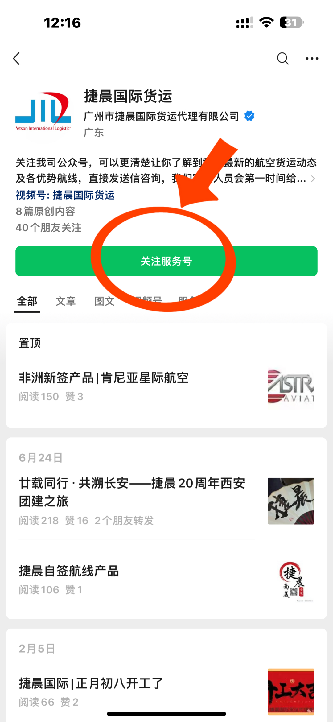 Step 1: 打开微信,关注「捷晨国际货运」公众号