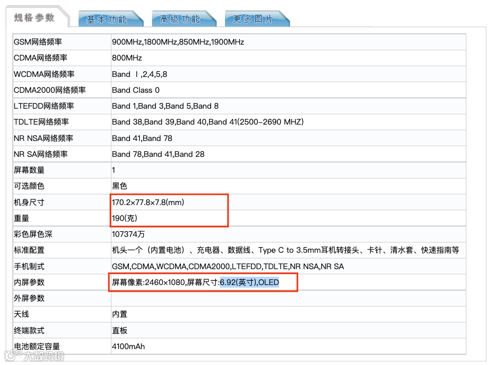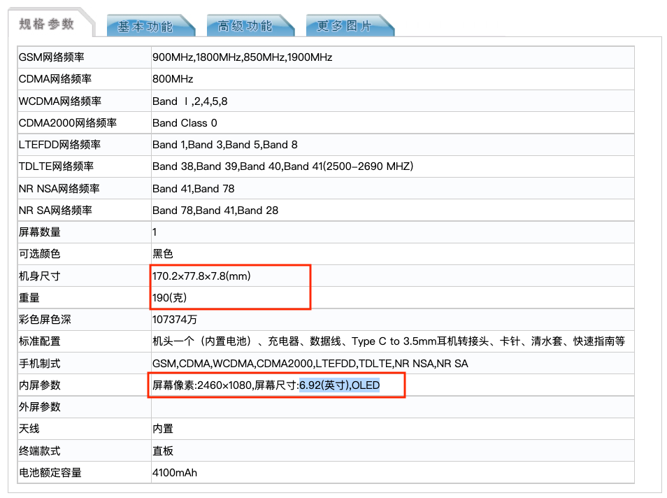 详细参数上,工信部已经可以查询到:中兴Axon 30采用6.92英寸2460*1080分辨率OLED全面屏,屏下指纹,机身三围170.2*77.8*厚7.8mm,重190g,电池容量额定值4100mAh,55W充电器。