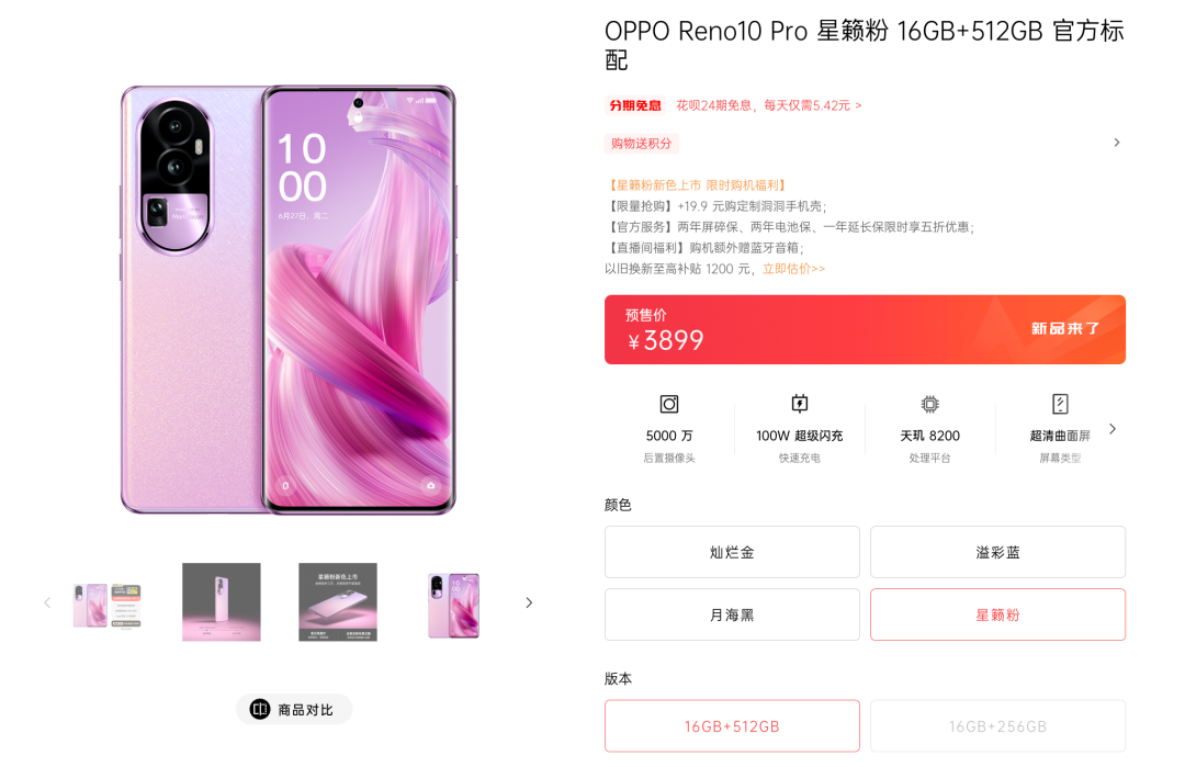 价格上,OPPO Reno 10 Pro星籁版及英雄联盟手游定制礼盒价格和其它配色常规版一致,仅提供16+512GB,无论是单独购买新配色的手机还是购买定制礼盒,都是3899元,礼盒今天起每天上午10点限量预订,数量有限抢完即止,7月5日10点正式限量开售。大家觉得这波礼盒版如何?