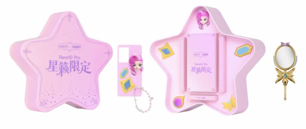 至于星籁·英雄联盟手游定制礼盒套装,礼盒内含:Reno10 Pro星籁版手机(16+512GB)*1、萨勒芬妮联名星光手持镜、萨勒芬妮联名灵感DIY手机壳、DIY套件。礼盒外包装以萨勒芬妮的星星泪饰为灵感,星形造型的礼盒包装。