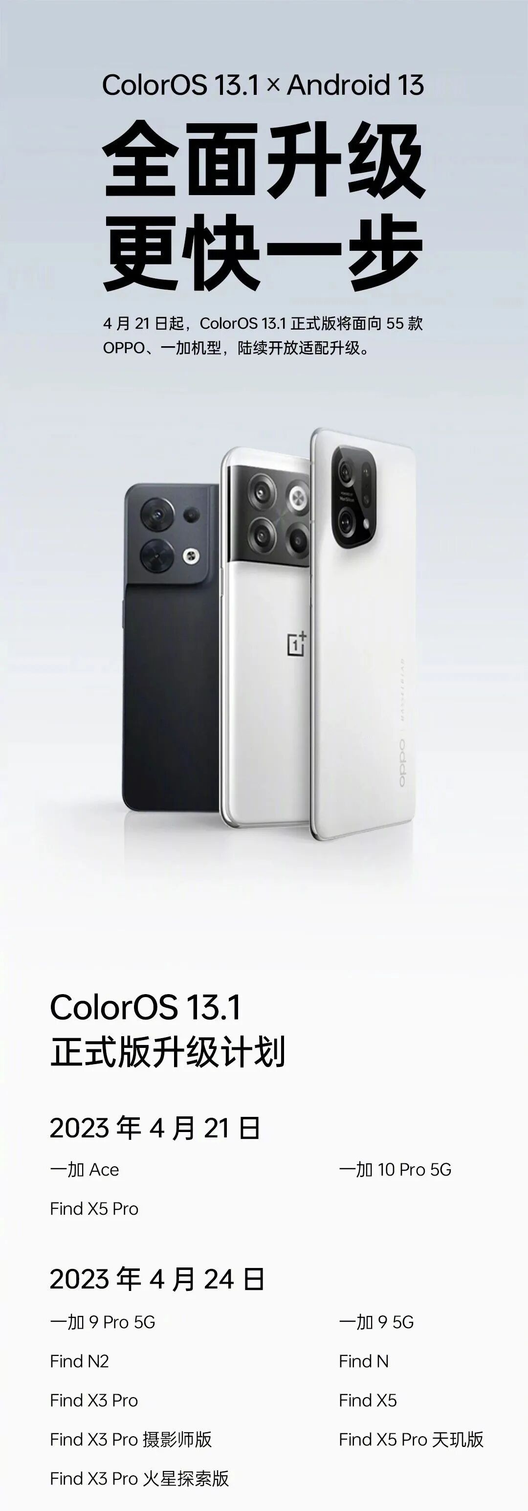 一加宣布:今天开始,一加已适配ColorOS 13的机型将全部适配ColorOS 13.1,并且在5月内全部适配完成。发布于2020年的一加8、一加8 Pro、一加8T也将适配ColorOS 13.1。