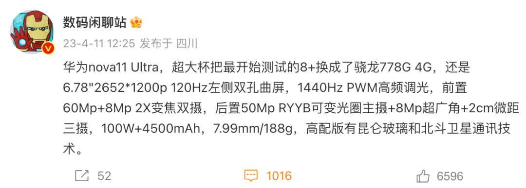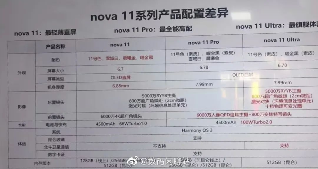 其还分享了华为nova 11系列三款机型的配置差异表,可以看到这次nova 11系列三款新机均有昆仑玻璃版本,北斗卫星通信则是nova 11 Ultra独有。细节上,nova 11标准版是直屏,机身厚度仅6.88mm,应该就是之前曝光的那款直屏+直角中框。骁龙778G...大家觉得nova 11 Ultra会卖多少钱?