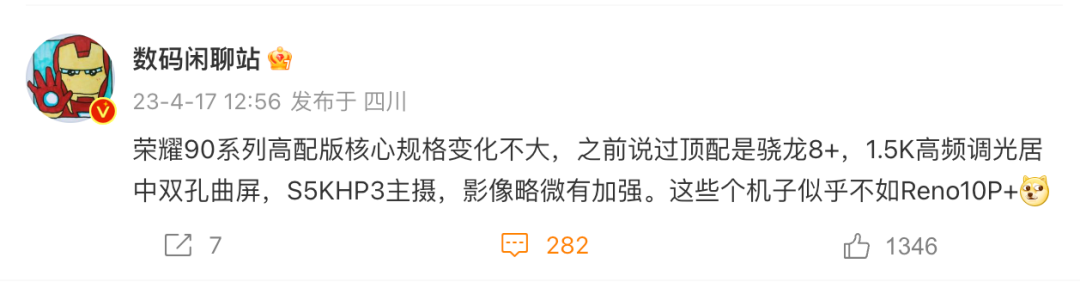 数码闲聊站爆料称荣耀90系列高配版核心规格变化不大:骁龙8+处理器、1.5K高频调光居中双挖孔曲面屏,后置主摄三星S5KHP3两亿像素传感器。