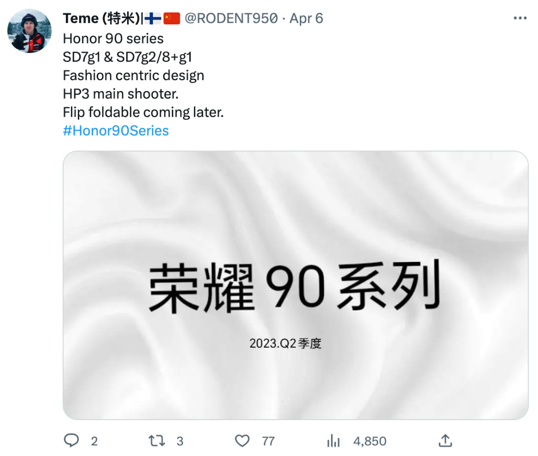 【新机】荣耀90系列配置曝光 1.5K曲屏/骁龙8+/两亿像素主摄