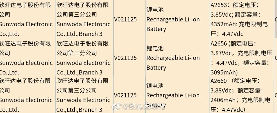 型号为A2653、A2656与A2660三款锂电池现身,额定容量分别为4352mAh、3095mAh与2406mAh