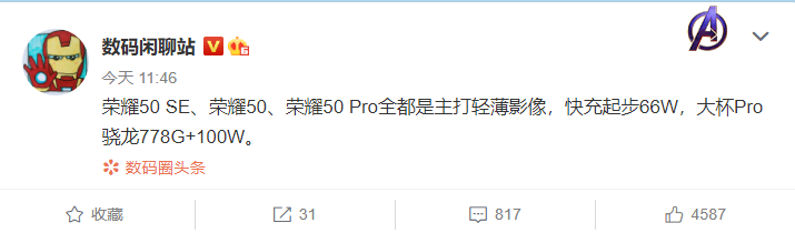 据爆料达人透露,这次有荣耀50 SE、荣耀50、荣耀50 Pro三款新机,三款均主打轻薄影像,快充部分是66W起步,荣耀50 Pro是100W快充,同时搭载骁龙778G处理器。