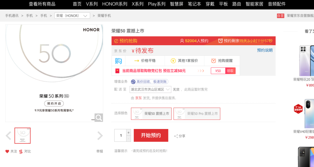 具体新机型号上,荣耀50系列目前已经开启预约,京东预约界面写着有「荣耀50」和「荣耀50 Pro」两款。