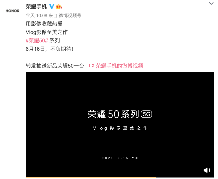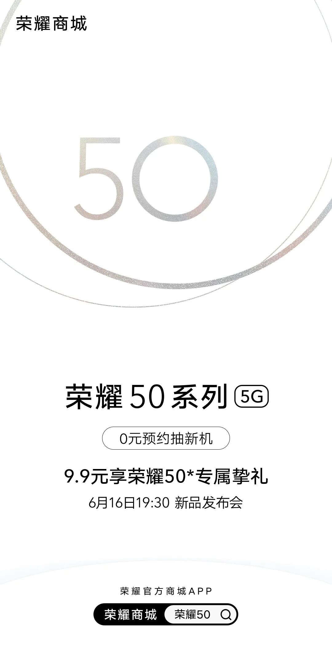 今天上午荣耀手机官方正式宣布 荣耀50系列发布会定档6月16日19:30 在上海举行。