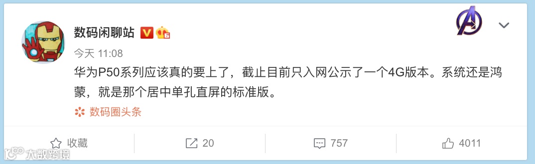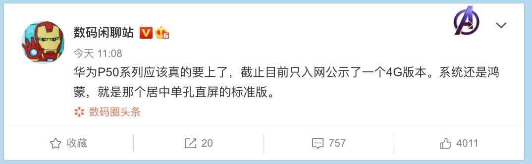 今天另一位爆料达人在微博表示:“华为P50系列应该真的要上了,截止目前只入网公示了一个4G版本,是采用居中单挖孔直屏的P50标准版,搭载鸿蒙系统。”小白这边暂时没有任何消息,上述爆料仅供大家参考,具体请以官宣为准。