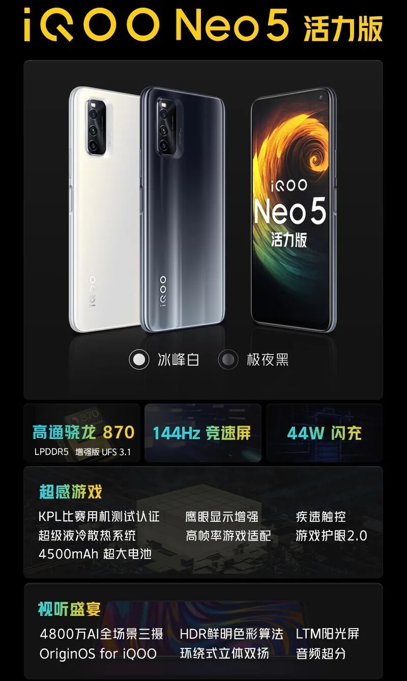 核心配置上,iQOO Neo5活力版前置16MP,后置三摄48MP+8MP超广角+2MP微距;搭载高通骁龙870+LPDDR5+UFS 3.1增强版,支持双模5G;4500mAh电池+44W充电;双扬声器,支持NFC,保留3.5mm耳机孔等。