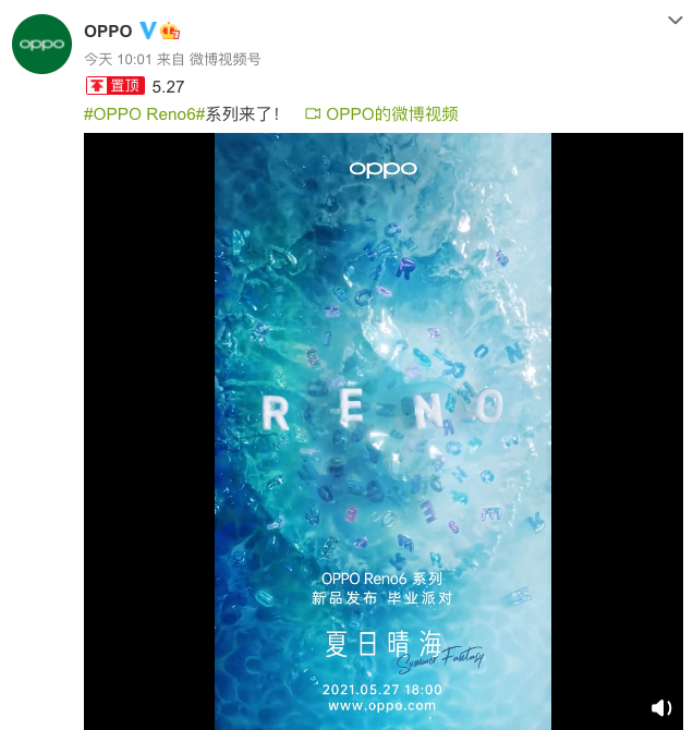 OPPO Reno6系列官宣:5月27日下周四晚上18点正式发布。
