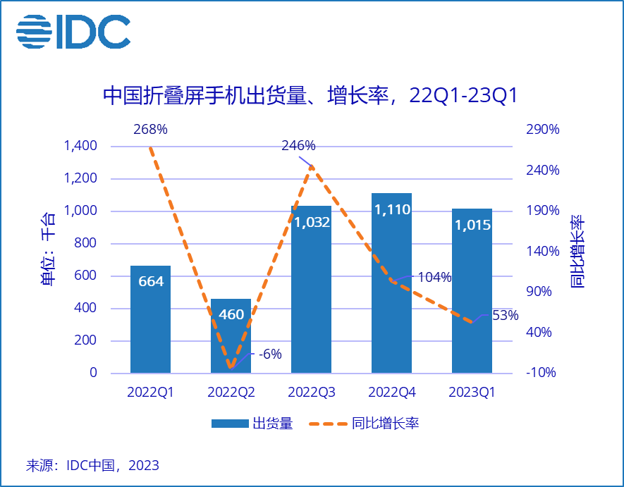 报告显示,2023年第一季度(1-3月)中国折叠屏手机市场整体出货量达102万台,同比增长52.8%。其中竖折产品份额继续上升至44.3%。