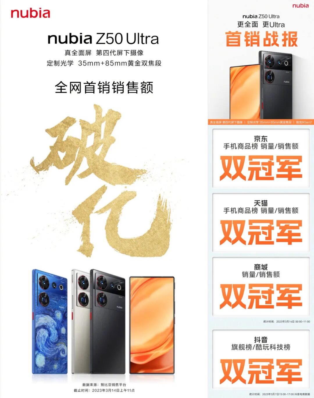 3月7日,努比亚发布了采用中兴第四代屏下技术的Z50 Ultra,屏下摄像头、屏幕无打孔、全面屏设计,正面颜值非常高,今天上午10点,这款手机正式迎来了开售,官方也在第一时间公布了首销战报。